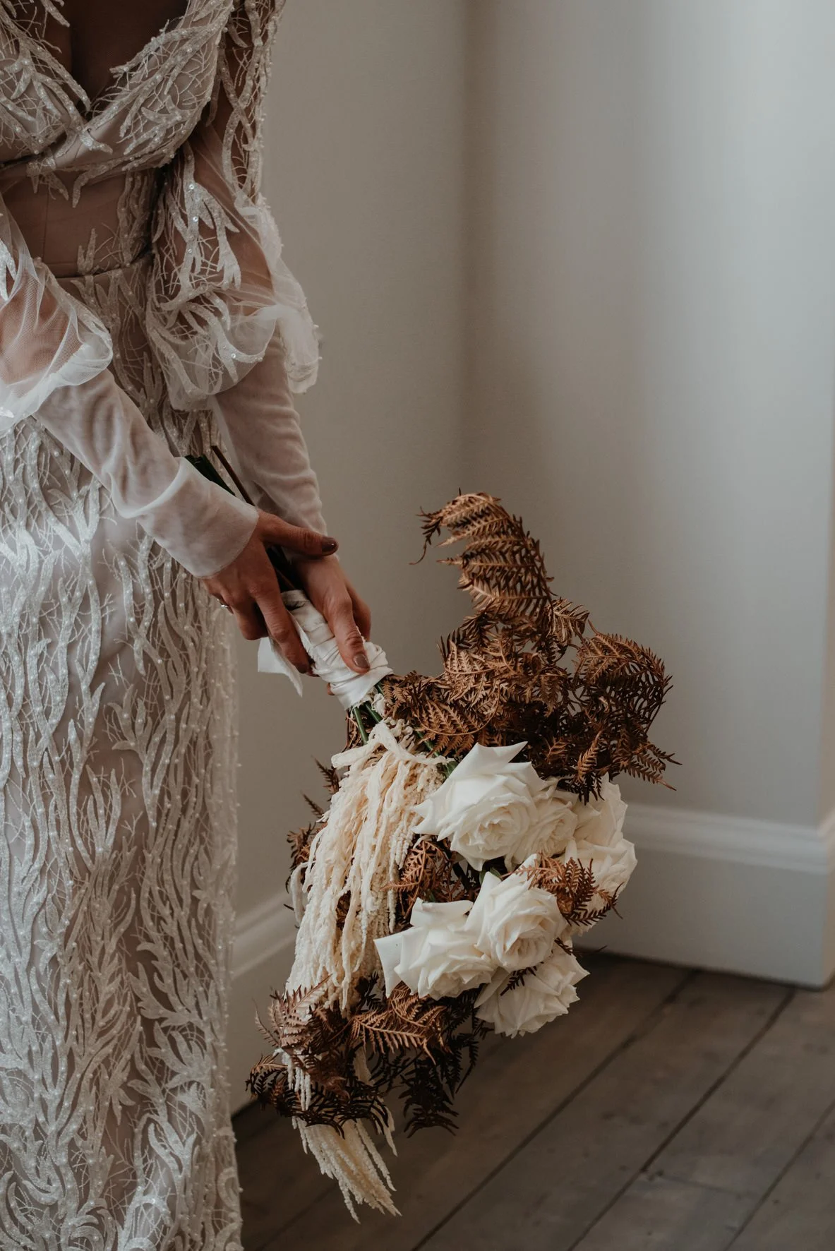 Blair is a modern slimline gown designed to contour and flatter. Embroidered linear lace, delicately embellished with subtle pearls and sequins, creates soft, sculptural lines across the body. The high neckline at the front offers understated elegance, while the back features hand-appliquéd lace and a row of GK’s signature satin buttons. Billowing sheer sleeves finished with dramatic tulle cuffs add a romantic, fashion-forward touch to this contemporary bridal look.