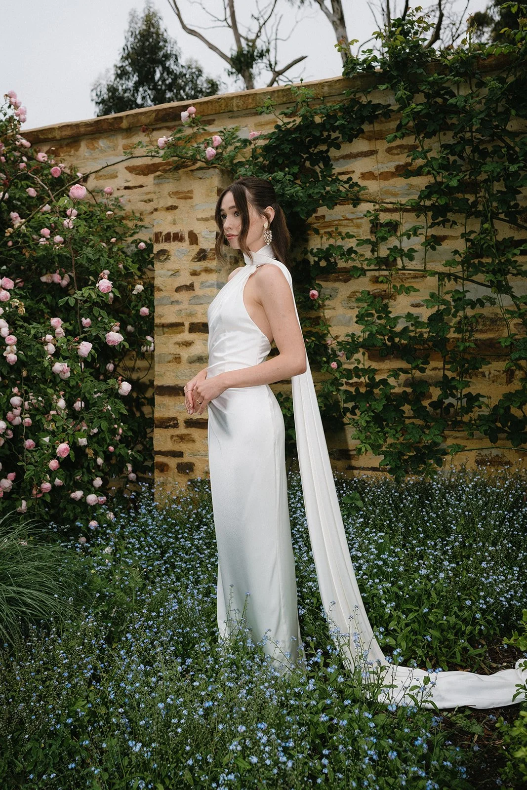 This satin gown features a dropped waist bodice, artfully draped to wrap around the body highlighting natural curves. The asymmetric neckline features a long neck tie creating drama to the column silhouette. It can be styled with a textured petal detachable tulle skirt.