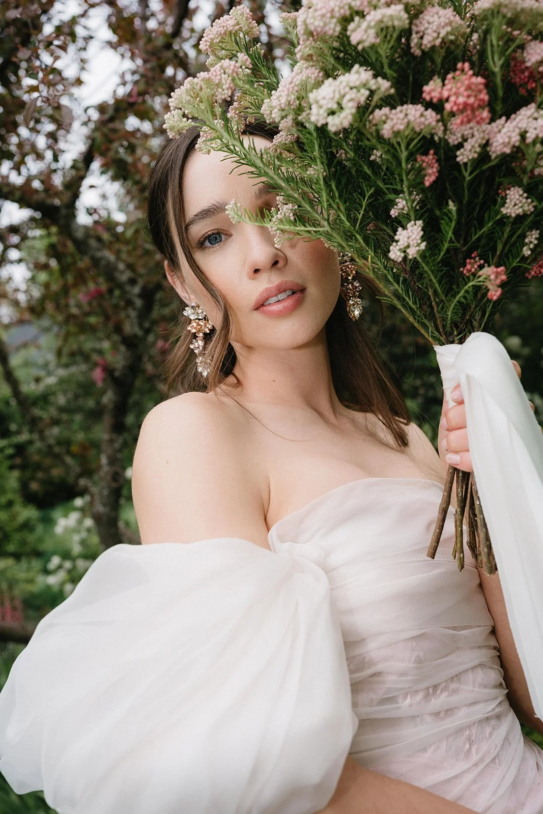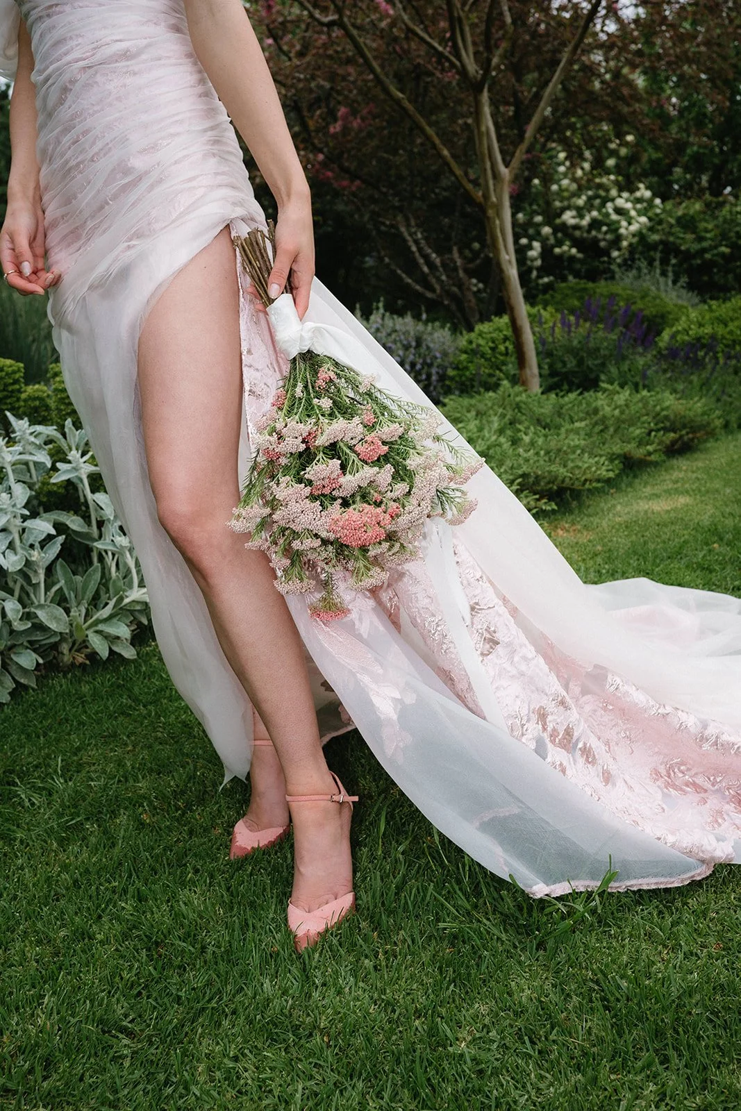 This stunning delicate pink embossed organza gown is draped artfully by hand in folds and pleats over the body, creating a soft, modern silhouette. With a voluminous off-the-shoulder drape for an added element of drama and elegantly fastened with GK signature button closure.