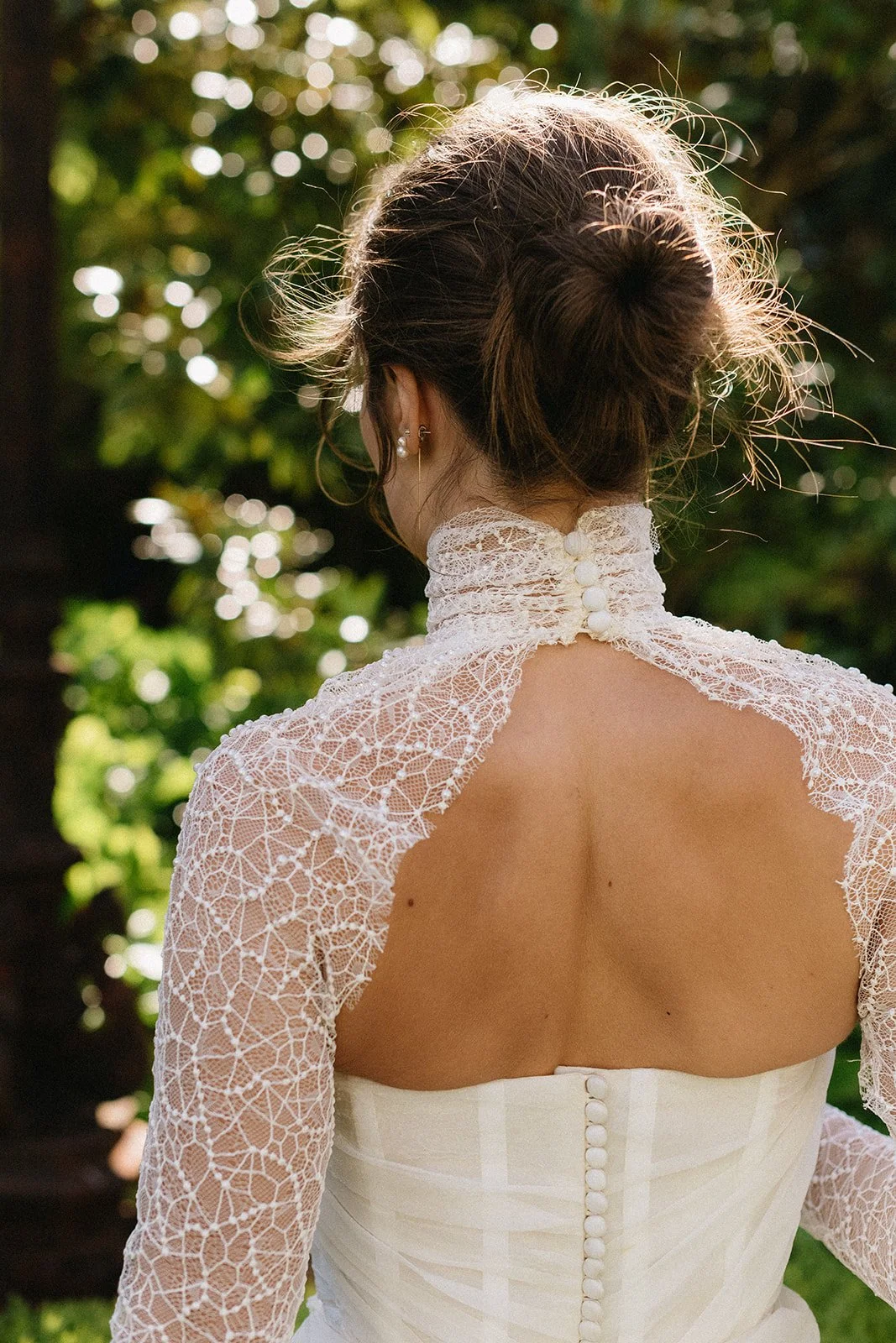 This stunning embossed organza gown is draped artfully by hand in folds and pleats over the body, creating a soft, modern silhouette. Exposed corseting gives a hidden detail as well as structure to juxtapose the soft draping. Styled with embroidered tulle lace bolero with high neckline, elegantly fastened with GK signature button closure.