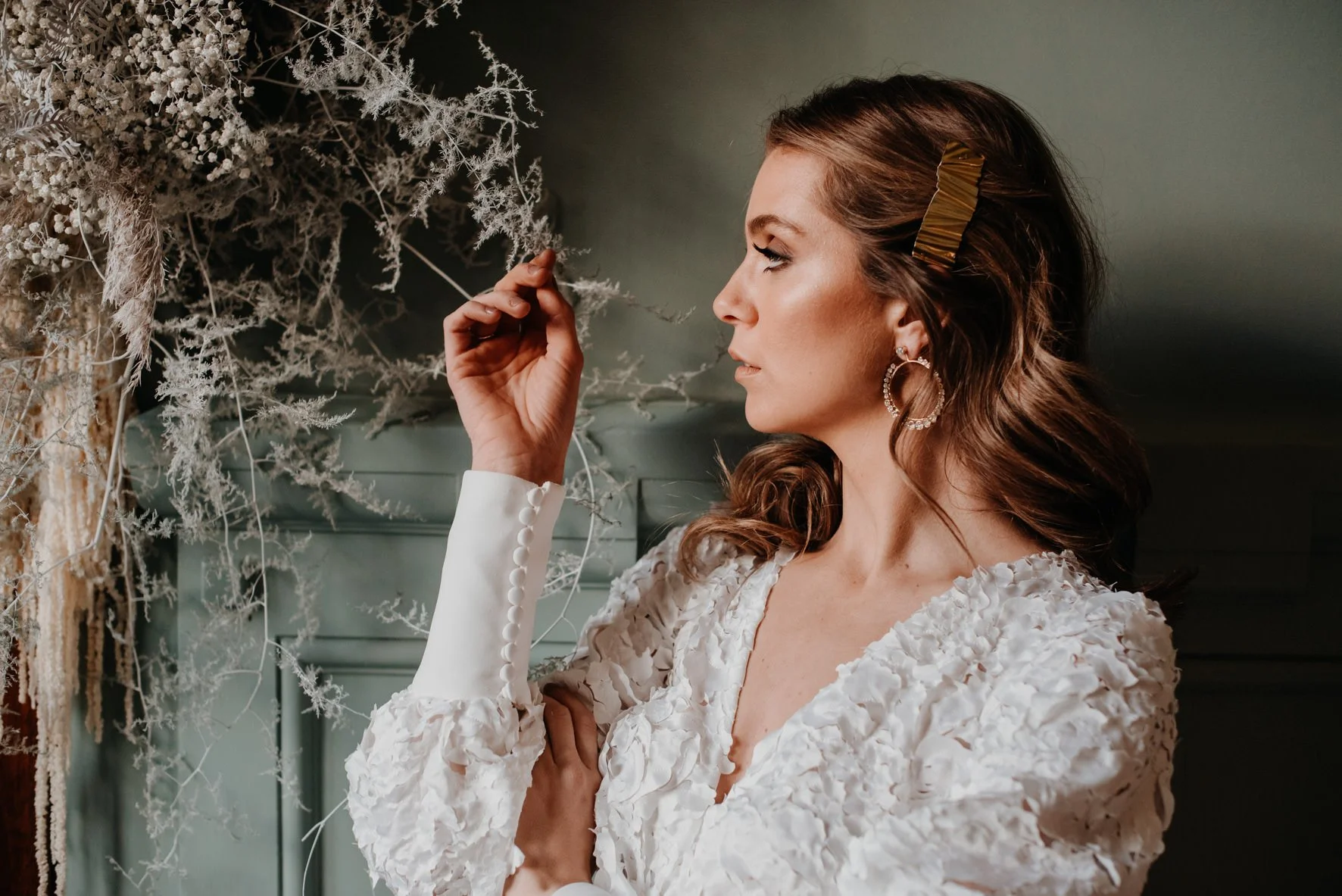 Bold yet effortless, Lacey is designed for the modern bride who values comfort without compromising on style. Organic shapes in laser-cut satin are intricately embroidered onto sheer tulle, creating texture and visual interest throughout the wrap-style silhouette. Voluminous, sculptural sleeves add drama, balanced by cuffs finished with GK’s signature satin buttons.