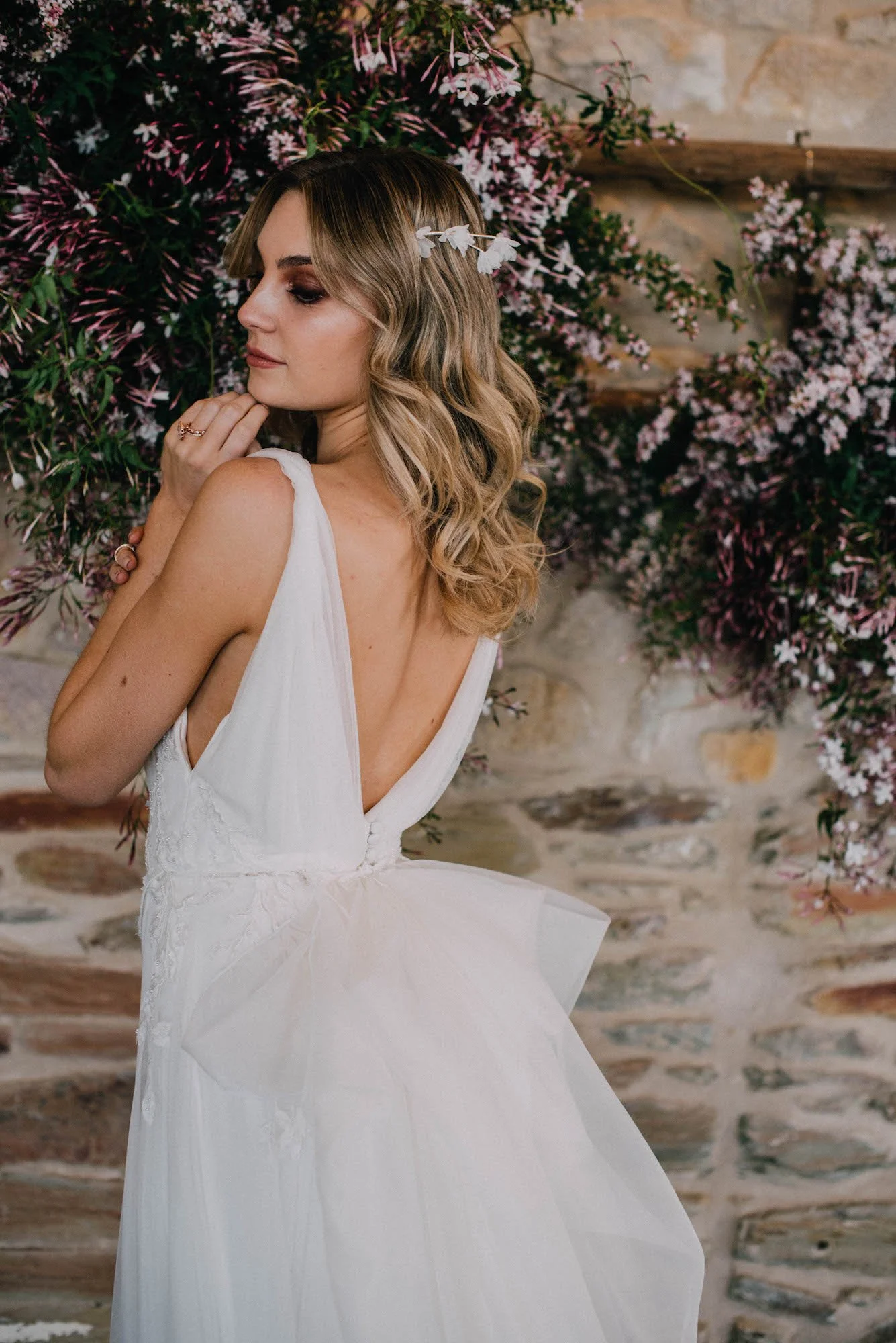 Amie seamlessly blends modern elegance with classic romance. Delicate silk mesh is artfully draped around the body, creating a flowing, ethereal effect. The asymmetric A-line skirt is paired with a daring split. Styled with a draped silk organza overskirt and hand appliquéd leaves and beaded flowers to accentuate the waist, to add dimension and intricate detail.